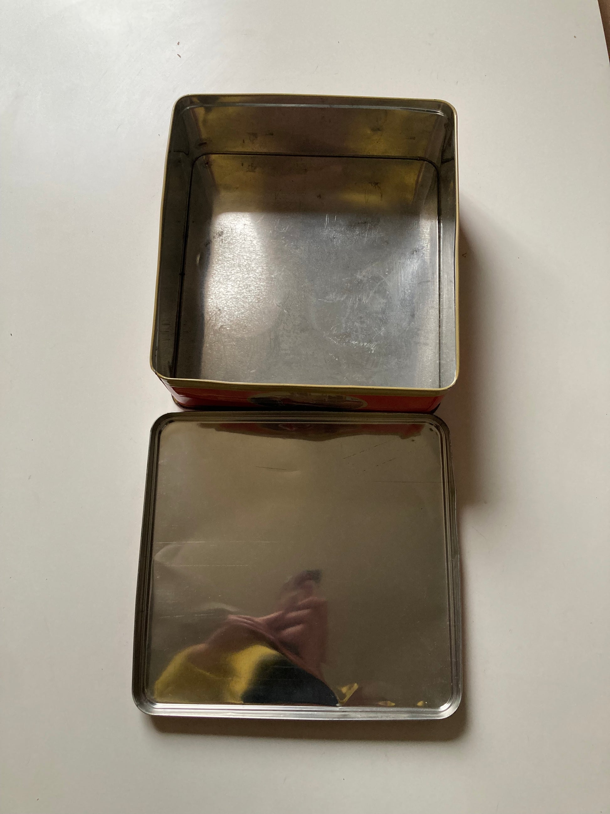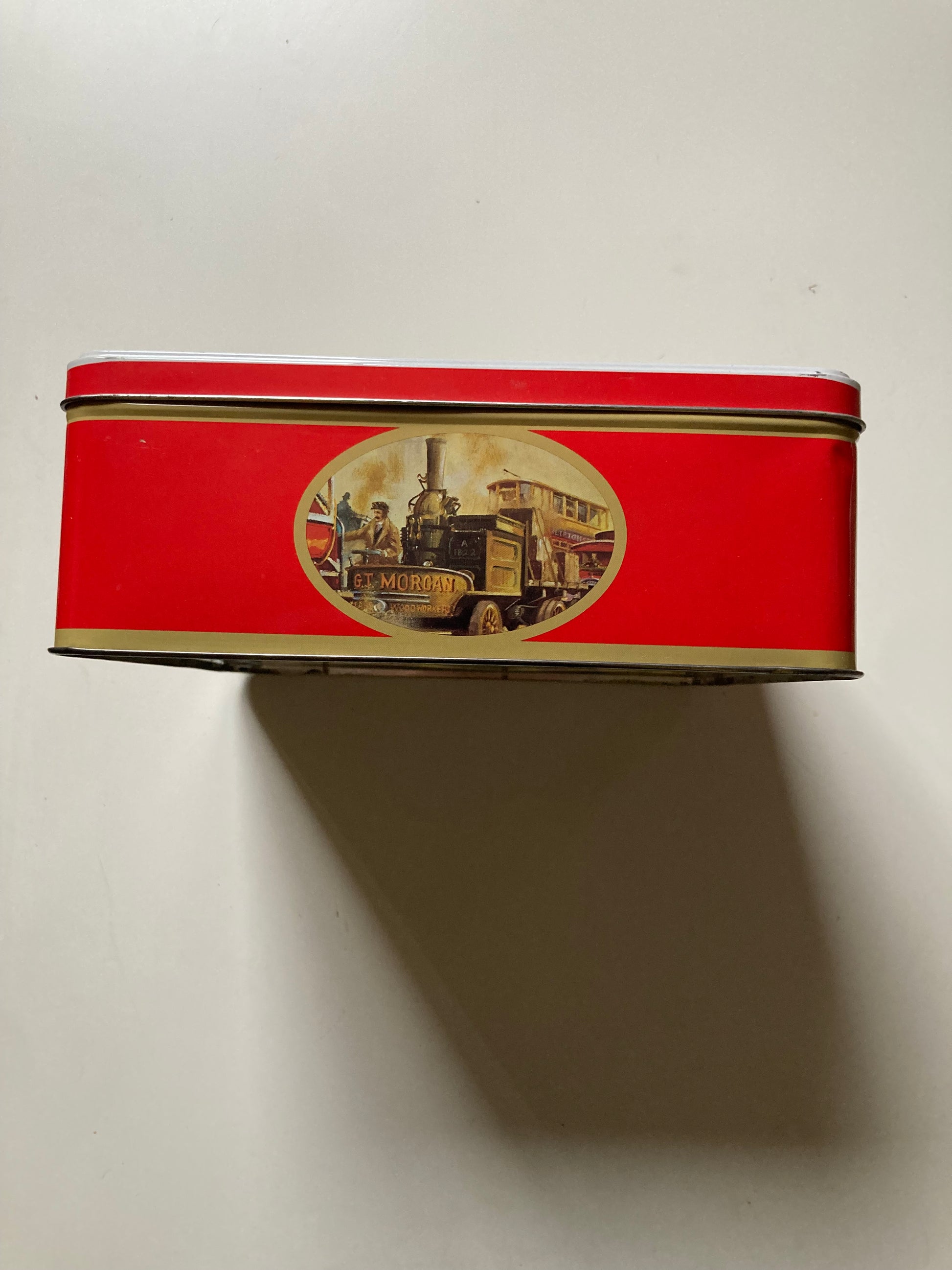 This vintage advertising tin from London features a design of a red double decker bus, likely used to promote a food brand in the United Kingdom. The tin is a collectable piece that showcases a nostalgic and original advertising concept, perfect for those interested in food advertising memorabilia. Made in the United Kingdom, this tin is a charming addition to any collection of tins or British advertising memorabilia.